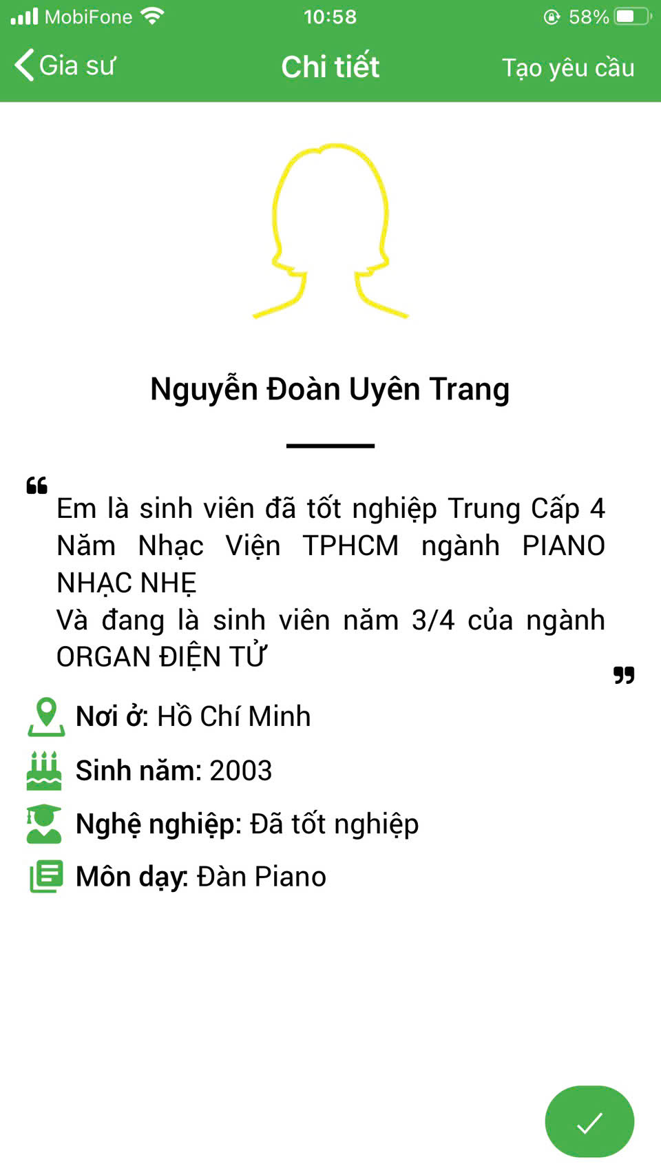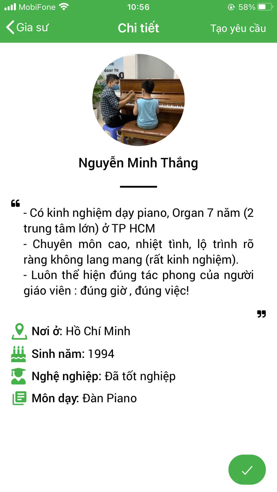 Học viên khi tìm gia sư dạy kèm đàn Piano tại nhà cho mình với mong muốn tìm được một gia sư có chất lượng tốt, giảng dạy nhiệt tình, trách nhiệm và đặc biệt là chuyên môn phải thật vững vàng. Các bạn hoàn toàn yên tâm khi đến với Trung tâm gia sư Tài Năng Trẻ. Chúng tôi tự hào là trung tâm gia sư giới thiệu giáo viên và sinh viên giỏi dạy kèm uy tín trên địa bàn Quận 3 tphcm. Trung tâm cung ứng gia sư uy tín tại Quận 3.